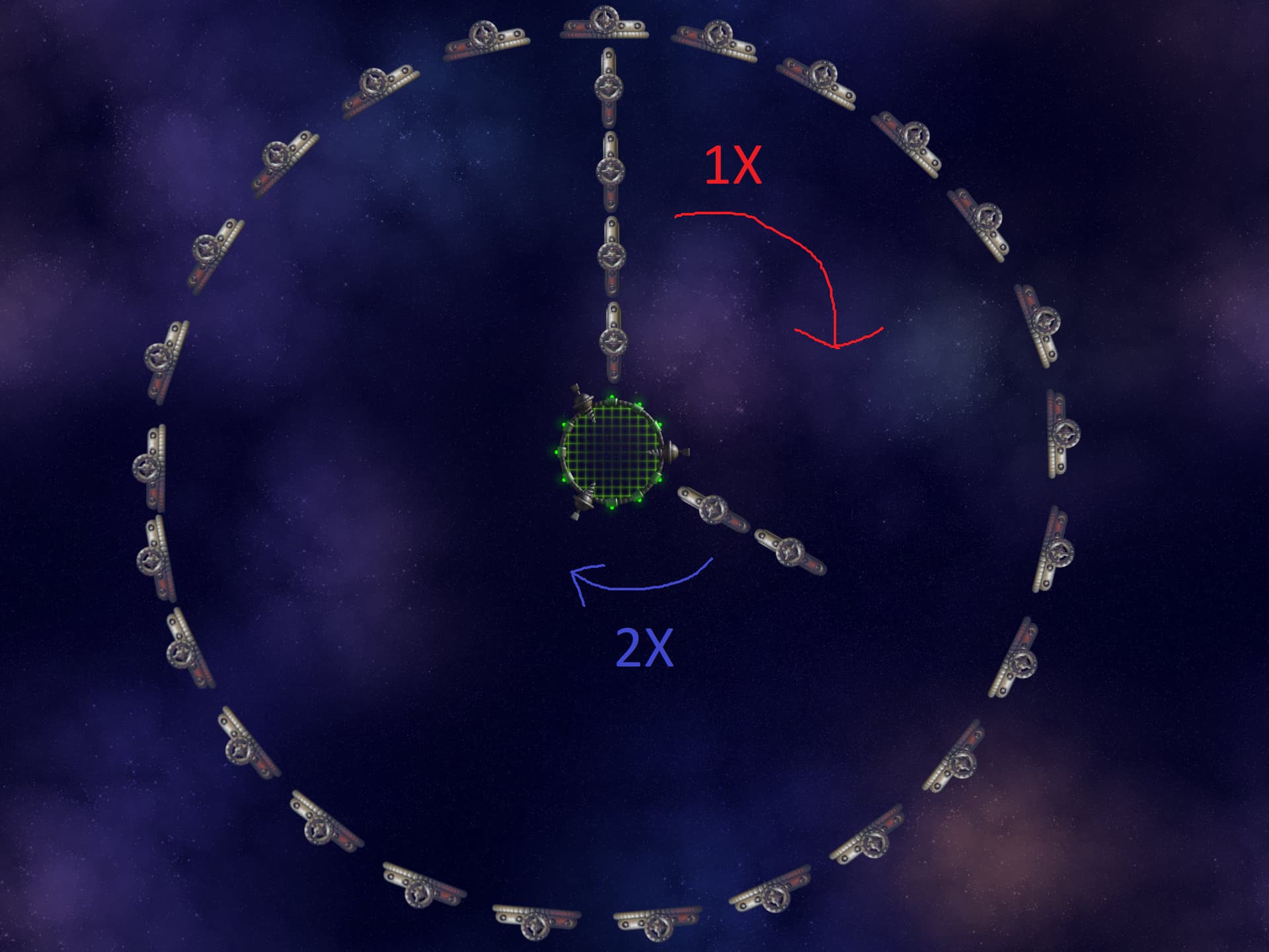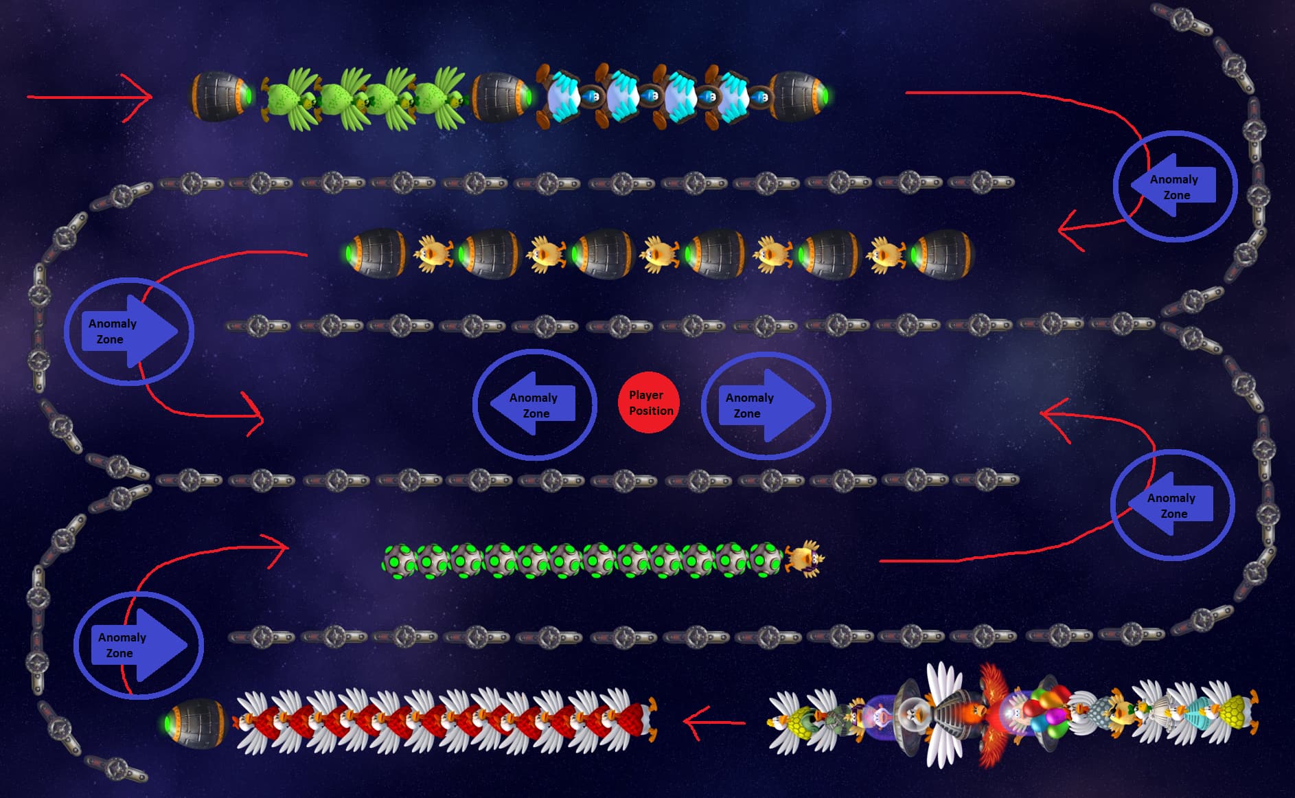 - Red circle presents playerâs position when the wave begins and blue arrows present anomaly zones.