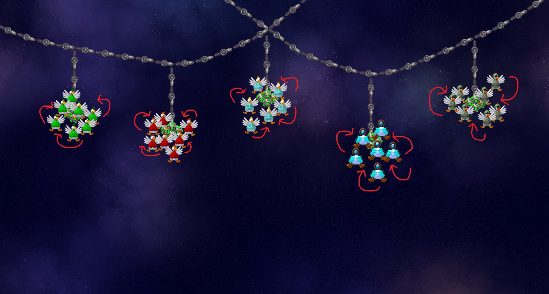 - Chickens in each group will ricochet on the sides of the screen.