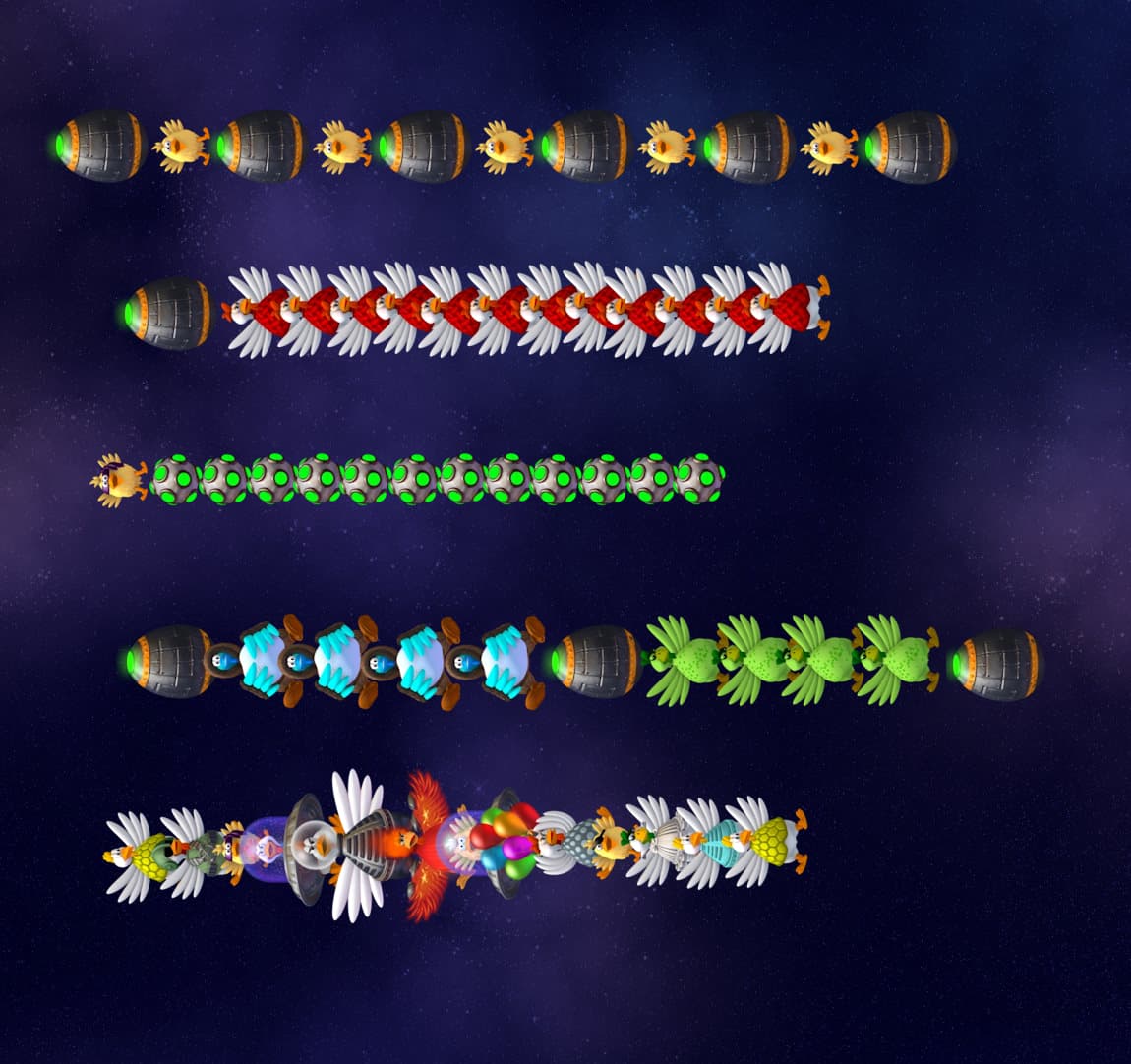 - In this wave chickens act like snakes that are crossing from 2 ways and player have to use anomaly zones to shoot them and protect himself.