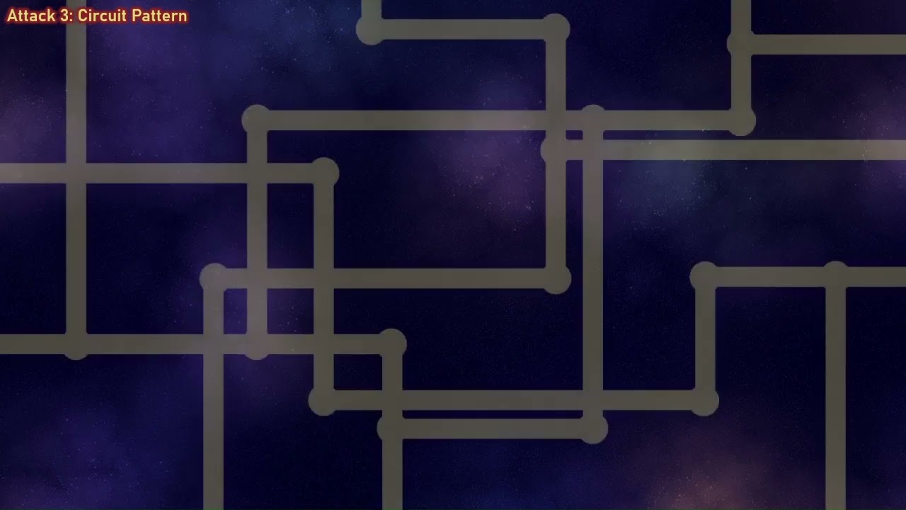 Teleport out of the screen, then summon a randomly arranged pattern of electric lines 3 times (The video below describe one time). The lasting duration of these electric lines is about 1 second. This attack happens less common than the first two attacks.