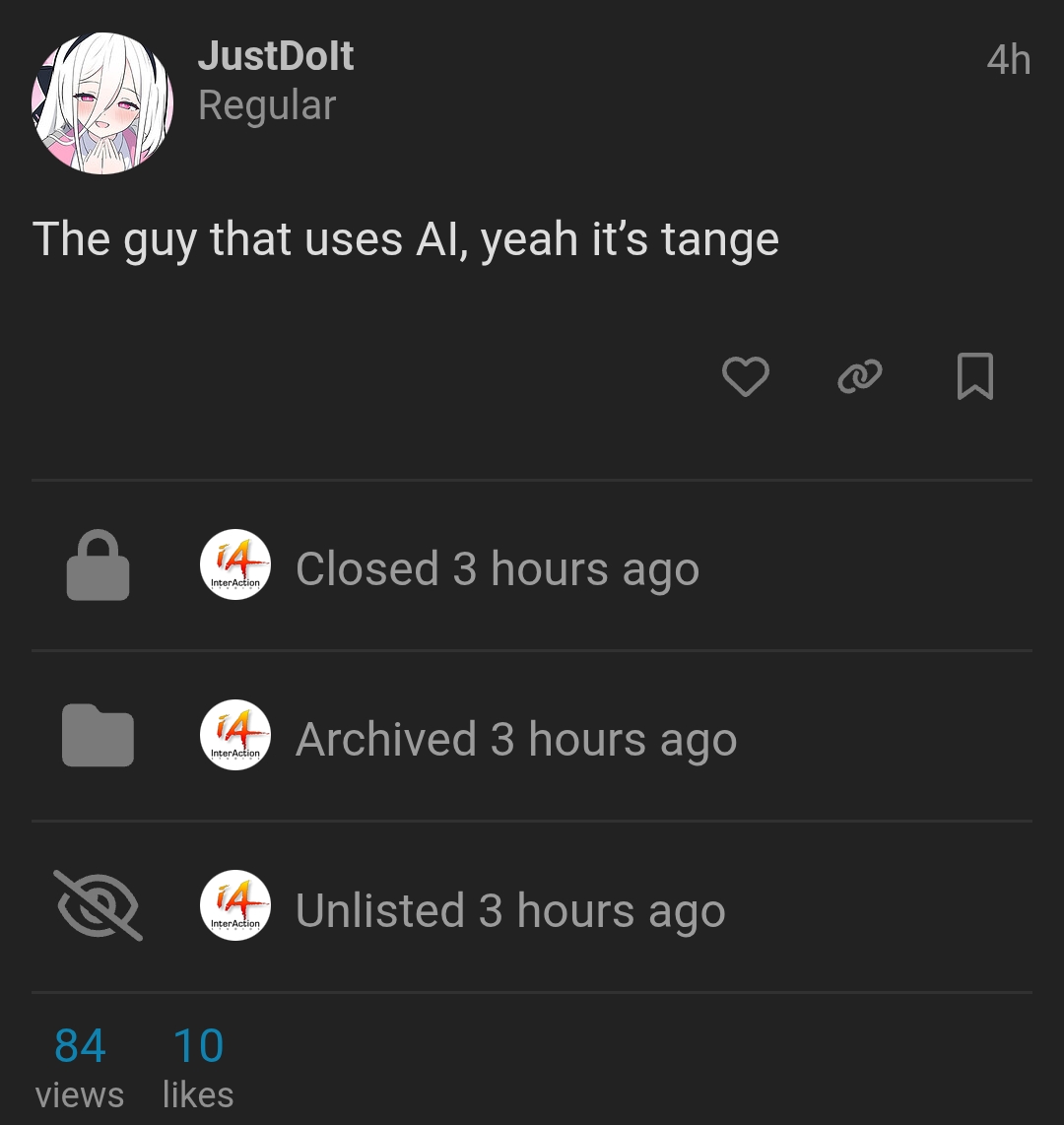 I didn’t target anyone. As Neonova said, be human, not AI. You can use AI for any doubt that you have regarding information or any other help, but not make it talk for you. You can see that any AI content is getting criticized because it’s not human-made