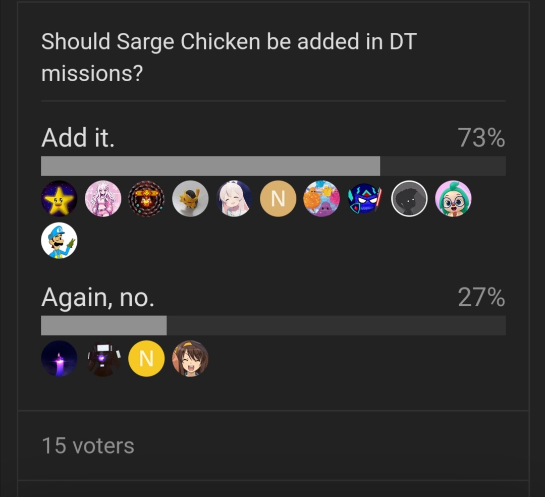 KnockoffFeline’s poll was about adding CI2 Mother-Hen ship to DT, mine was about adding Sarge chocken to DT, so it’s shouldnt be confusing xd