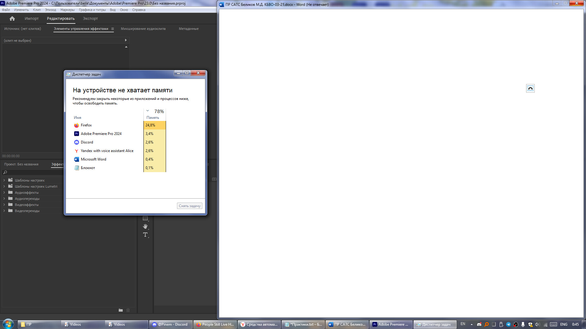 That little weird thing on the left is the task manager that complains with large letters that the device lacks memory, and recommends me to close something (it does not specify which memory but I assume it’s the RAM one), while showing 80% usage in total and 20% (8 whole gigs, damn) for firefox alone. But even in this scenario I STILL had around 6 gigs of free space which is not little, though it must not have been at 78% total usage in the first place because there is nothing launched that takes even remotely much enough to compete with firefox (premiere doesn’t count, it was launched after the issue has spawned).