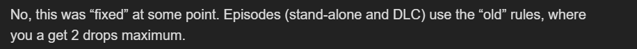 No, this was âfixedâ at some point. Episodes (stand-alone and DLC) use the âoldâ rules, where you a get 2 drops maximum.