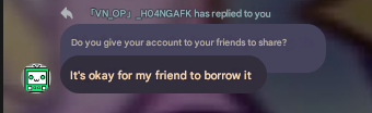 I will explain the content of the message in this photo,when I asked about the player who was banned yesterday for no reason,i was a little suspicious and asked him if he shared his account with another player,this person replied to me,"My friend borrows it all the time,no problem"If you dont believe me,please translate this image from Vietnamese to English. I hope there will be a suitable punishment for this account.