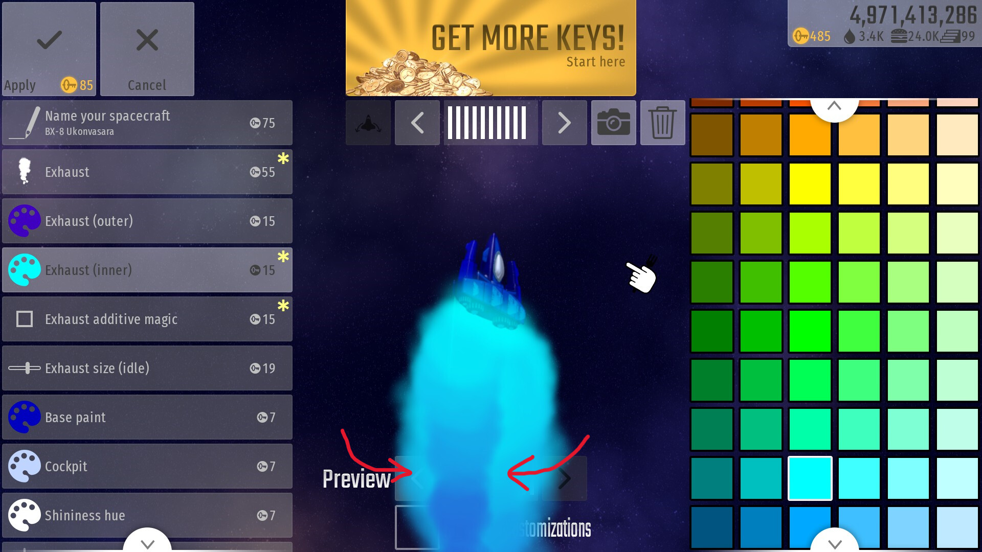 When I was editing my ship (the BX-8 Ukonvasara to be exact), I realized that if you use this exhaust (the one in the picture) on certain colors (the two shade of blue in the picture for example), put it at full throttle (the bar next to âPreviewâ) and lean the ship to either left or right, you get a very odd visual glitch where the arrows are pointing at. Please fix this soon because this is quite uncomfortable to look at.