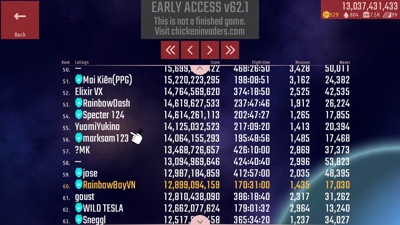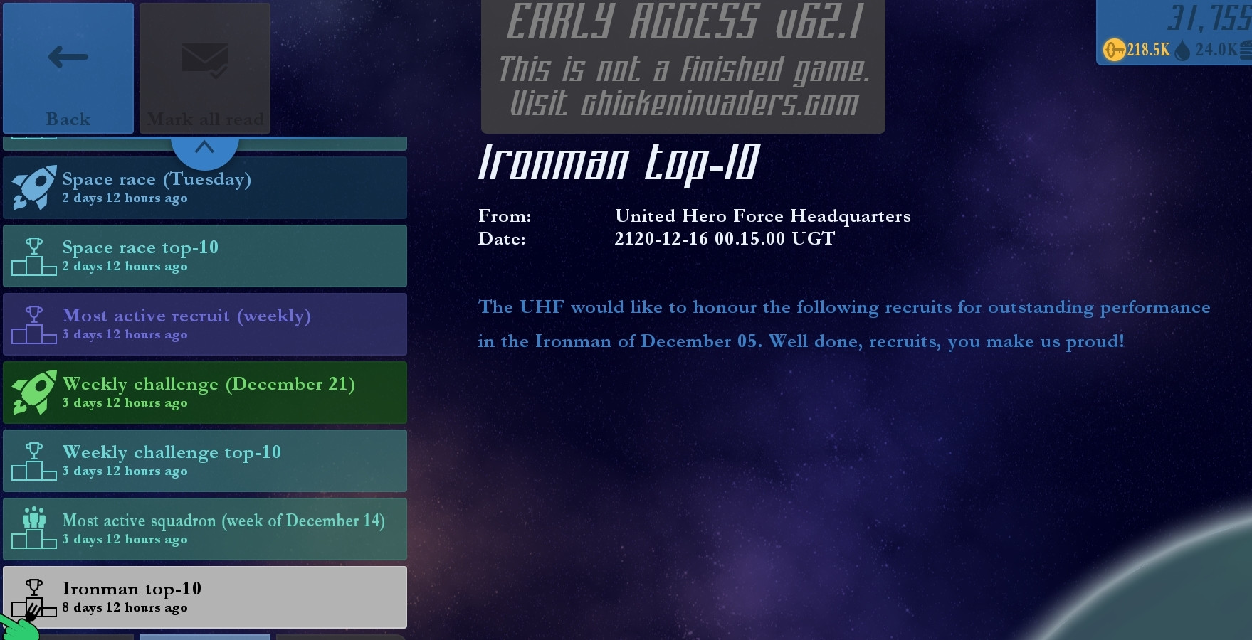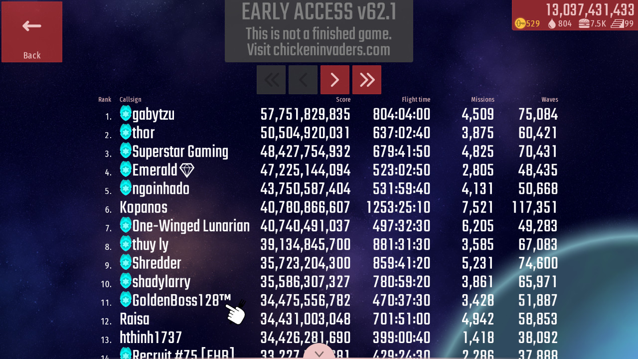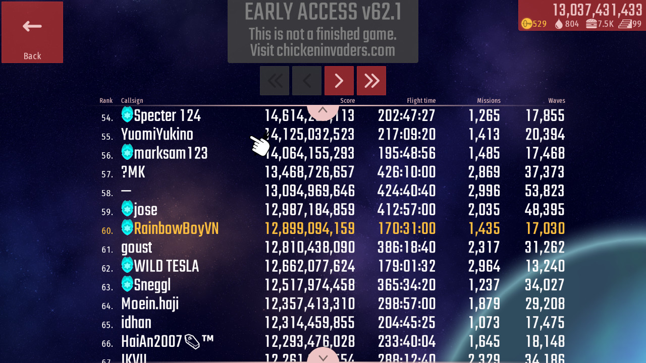 First, there’s the blue stuff on top of the white stuff. I’m guessing that the white item is supposed to indicate the mission that I just flew, with a score of 12,637,132… a few minutes ago, not 21 hours ago. I did fly the same mission yesterday, presumably 21 hours ago; I don’t know its score. Definitely not a year ago.