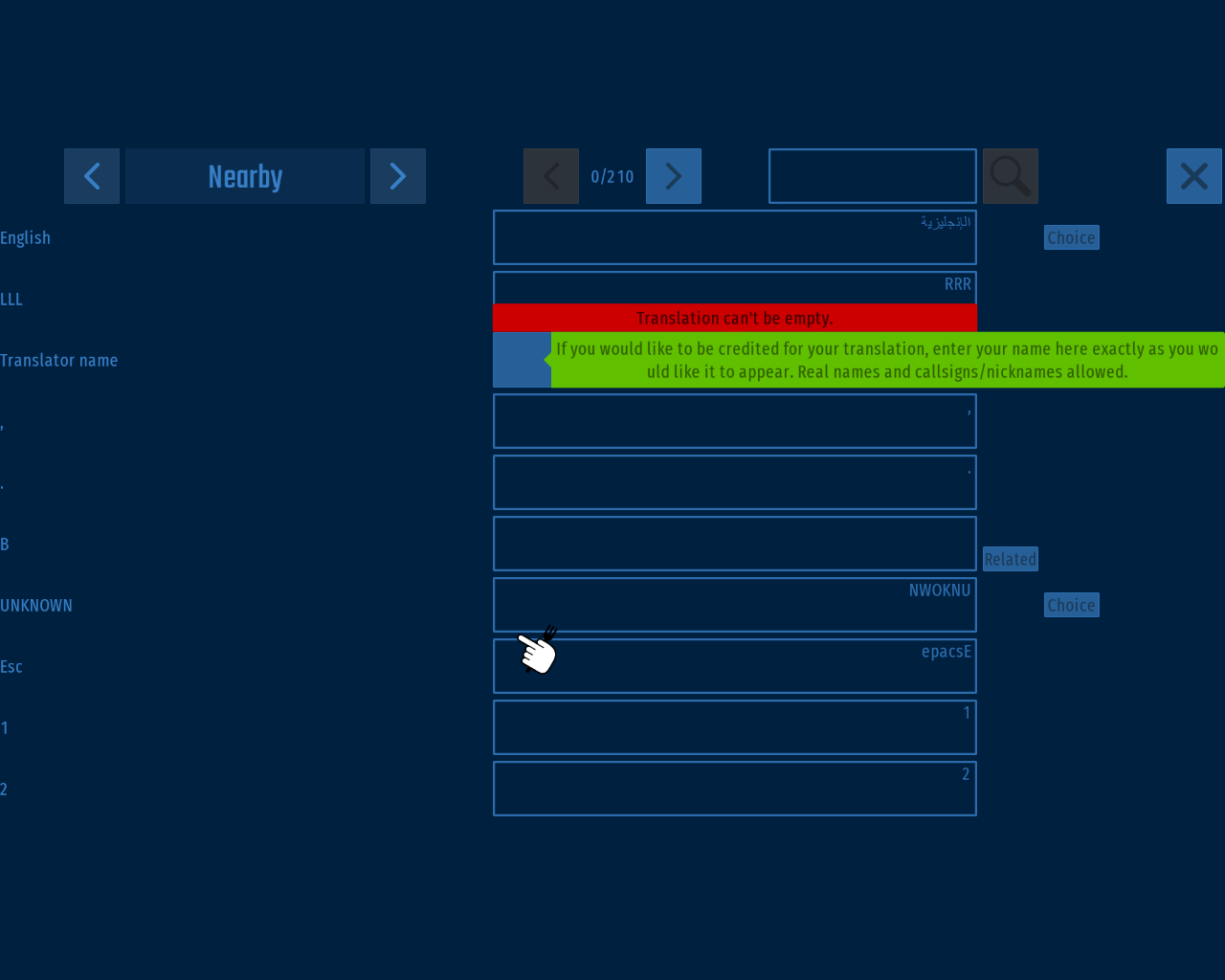 Ugh, no. I take your point, though, but the game has no way to distinguish between something that was left empty on purpose and something that’s empty because it’s not translated yet. I could change it so you would need to enter – or N/A, but that’s more special-case code.