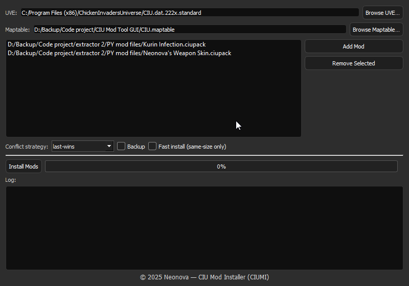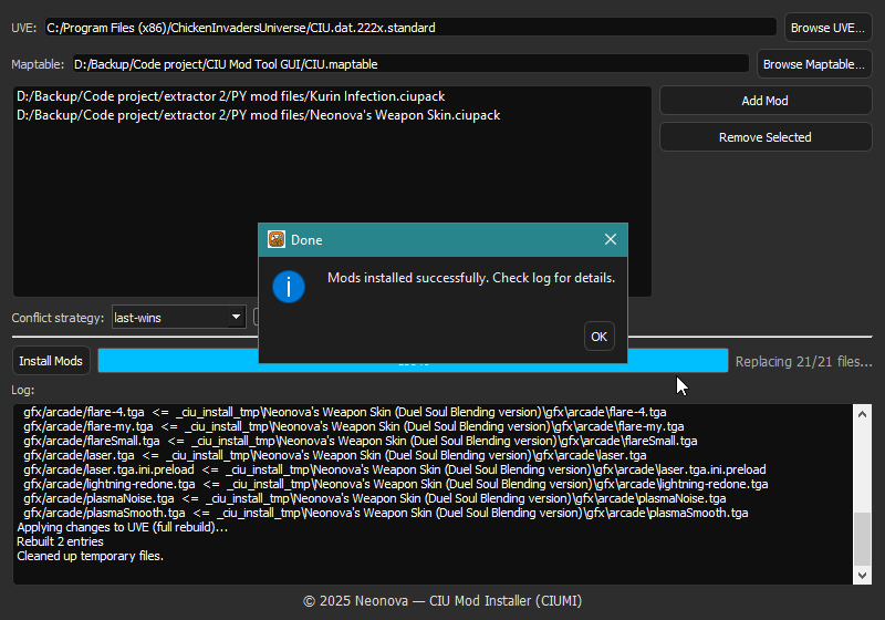 Neonova’s Chicken Invaders Universe Mod Installer with a GUI, mainly to install mods with .ciupack format.