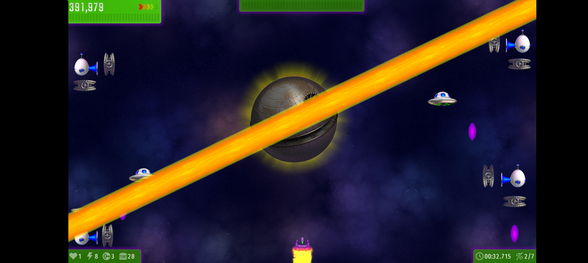 For the first phase, you would have to destroy the barrier bomb to pop the giant bubble, which ll make the death star activate its second phase, making it shoot a giant 2 way Lazer, with ufos sliding up often