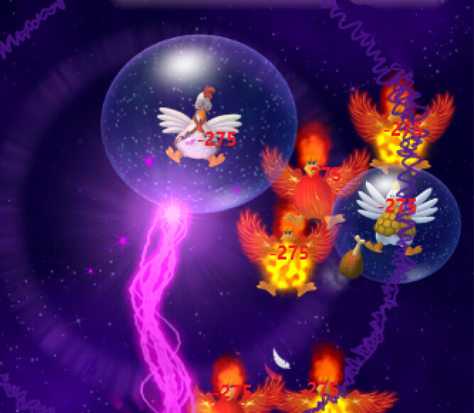 -After hitting an enemy they will become electrified taking 210 damage over 3 seconds. The lightning has a chance to chain again from the electrified chicken to hit even more enemies