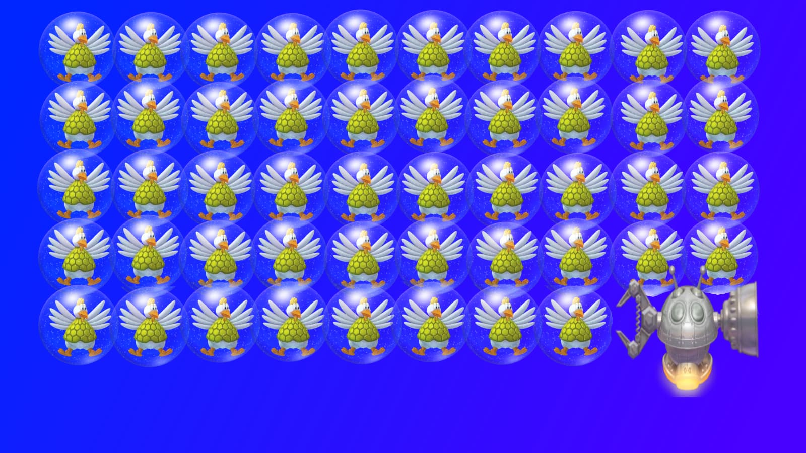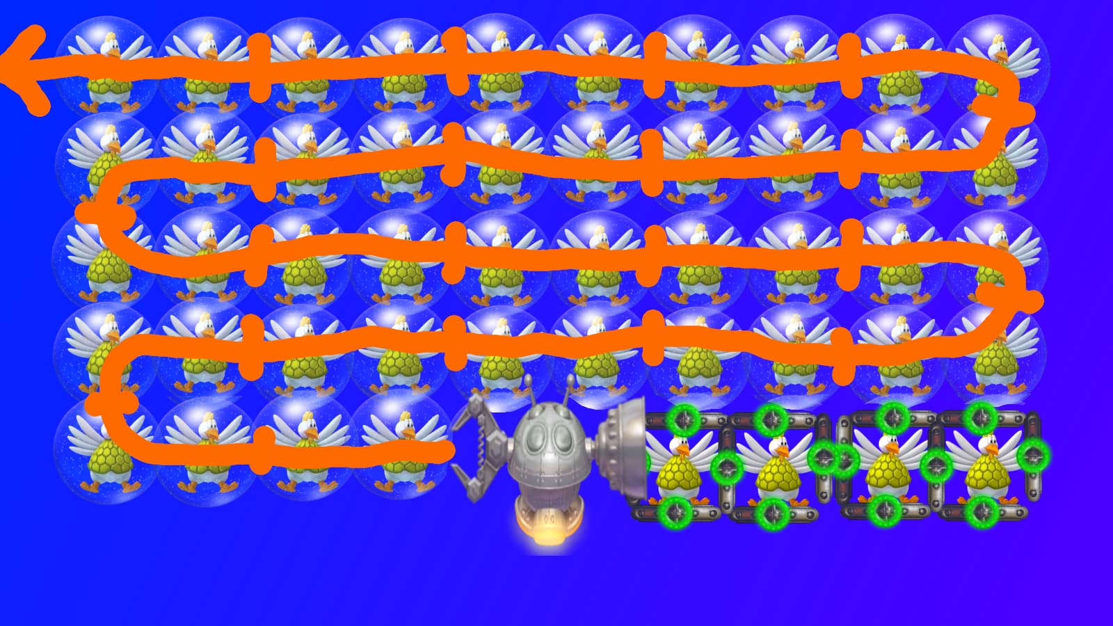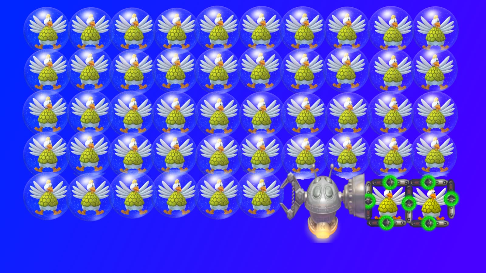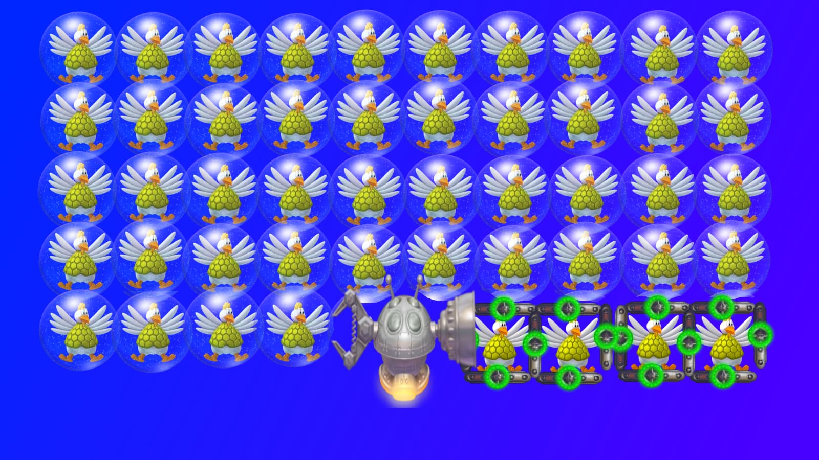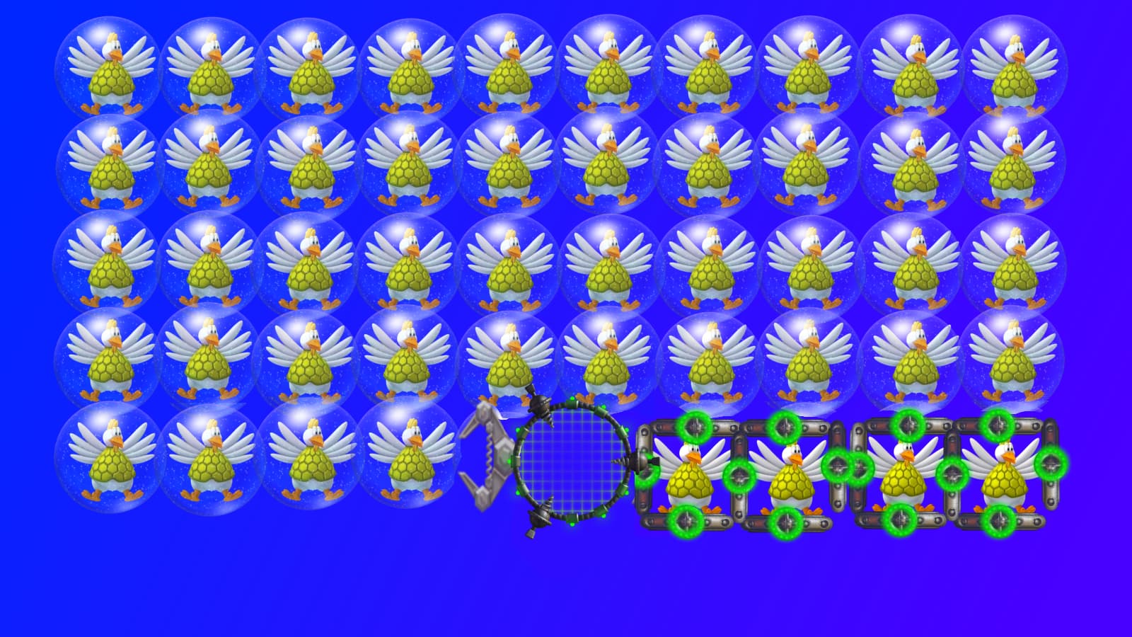 That’s a good point. When thinking about this wave I had another idea that the spaceship is locked with invincible barrier that will disappear when all chickens are caged, but decided that it’s too much waiting when the player can already shoot at the bottom right line pretty much straight away. So the use of bubbles instead.