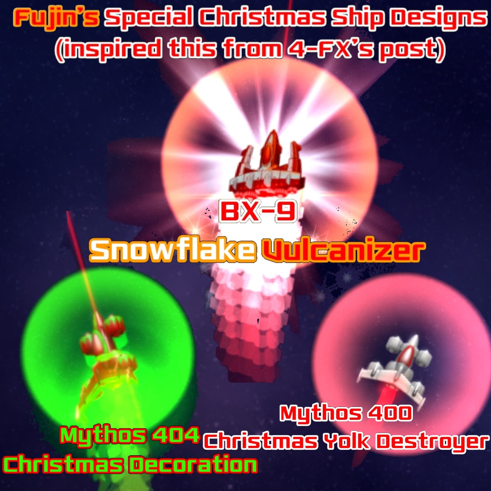 So it is the Christmas month of year 2023 (or 2123 in game), I wanted to share you guys my beautiful spaceship designs for christmas yes, inspired from 4-FX for the type of the post, so here I go