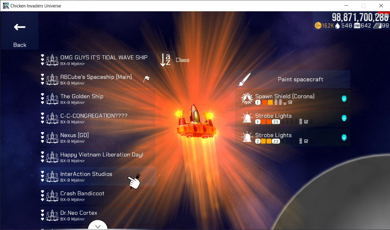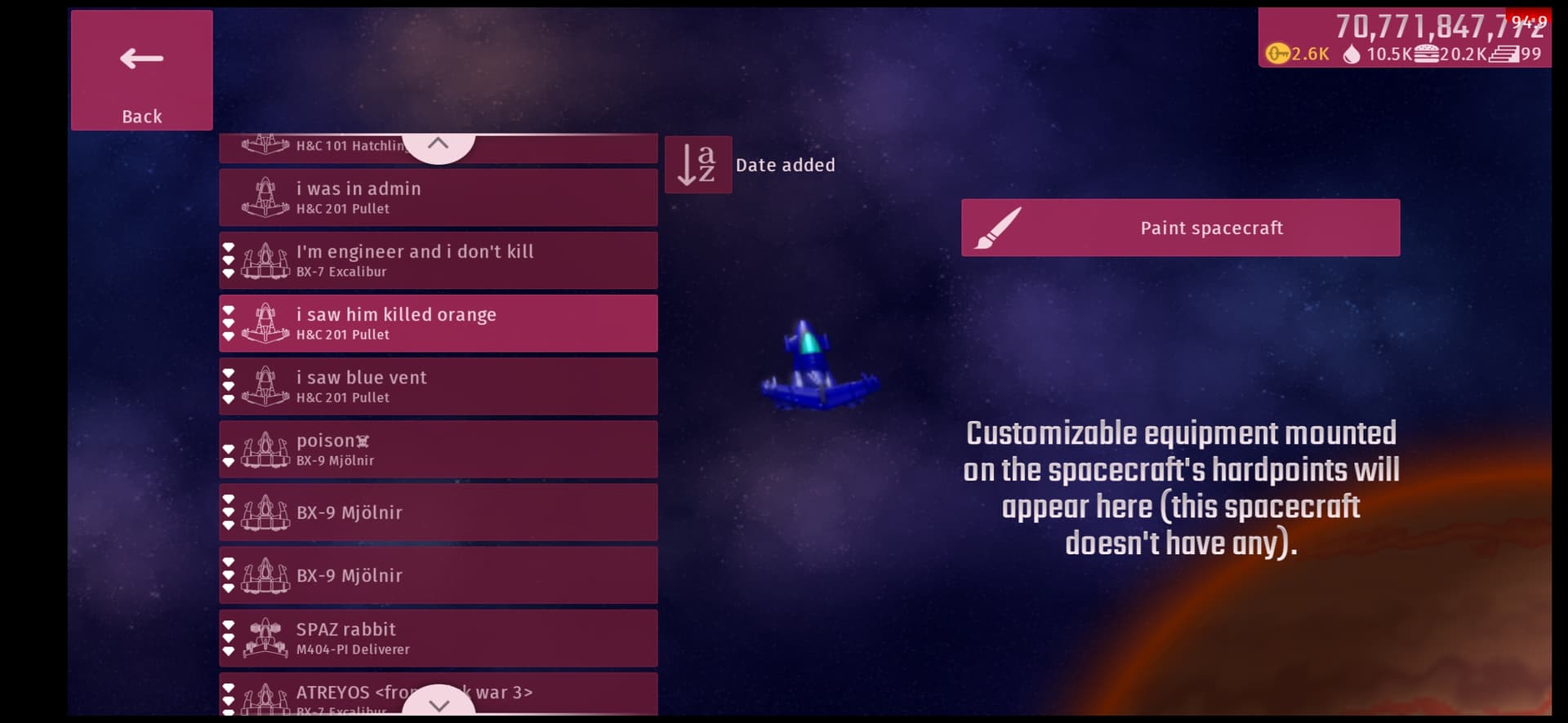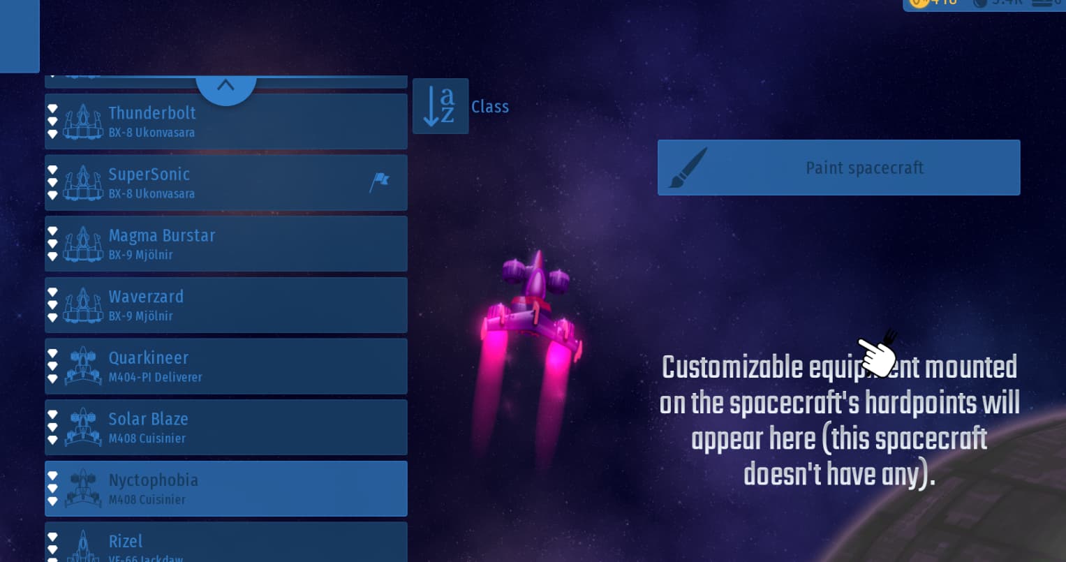 This is the slim VK-56 Starling model which offers the best balance in firepower and dodging. It’s the only custom ship I have or use and works very well in imitating the default ship while having much more capacity for powerups and satellite usage.