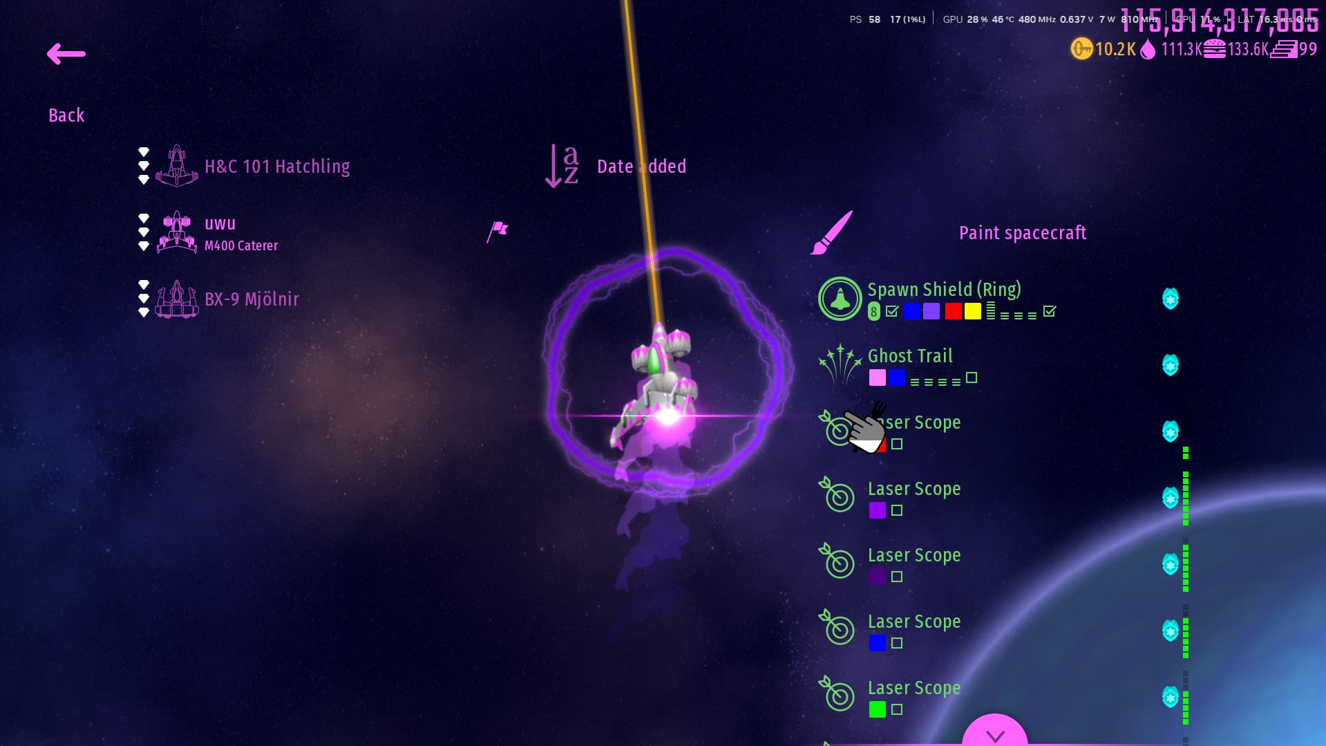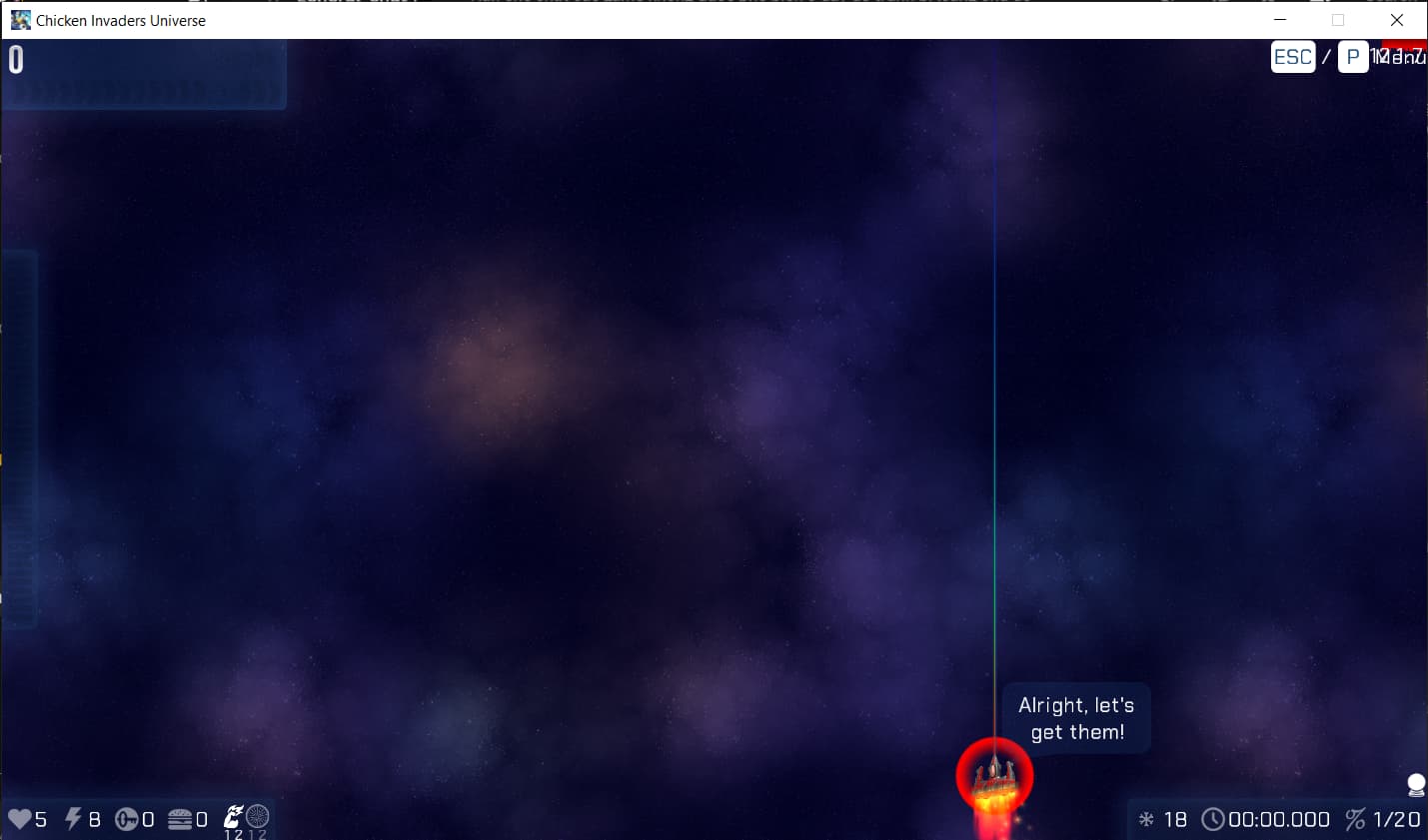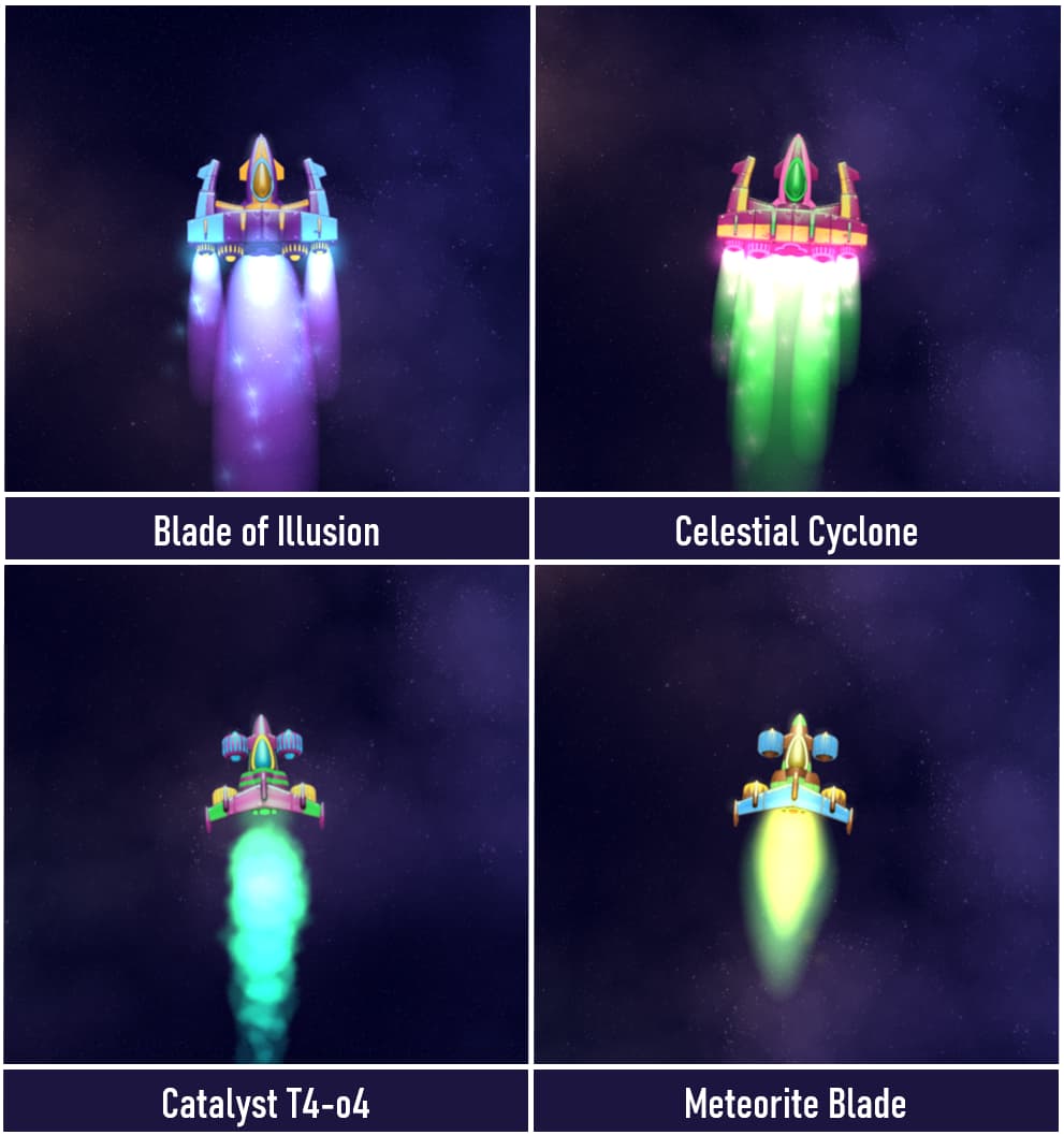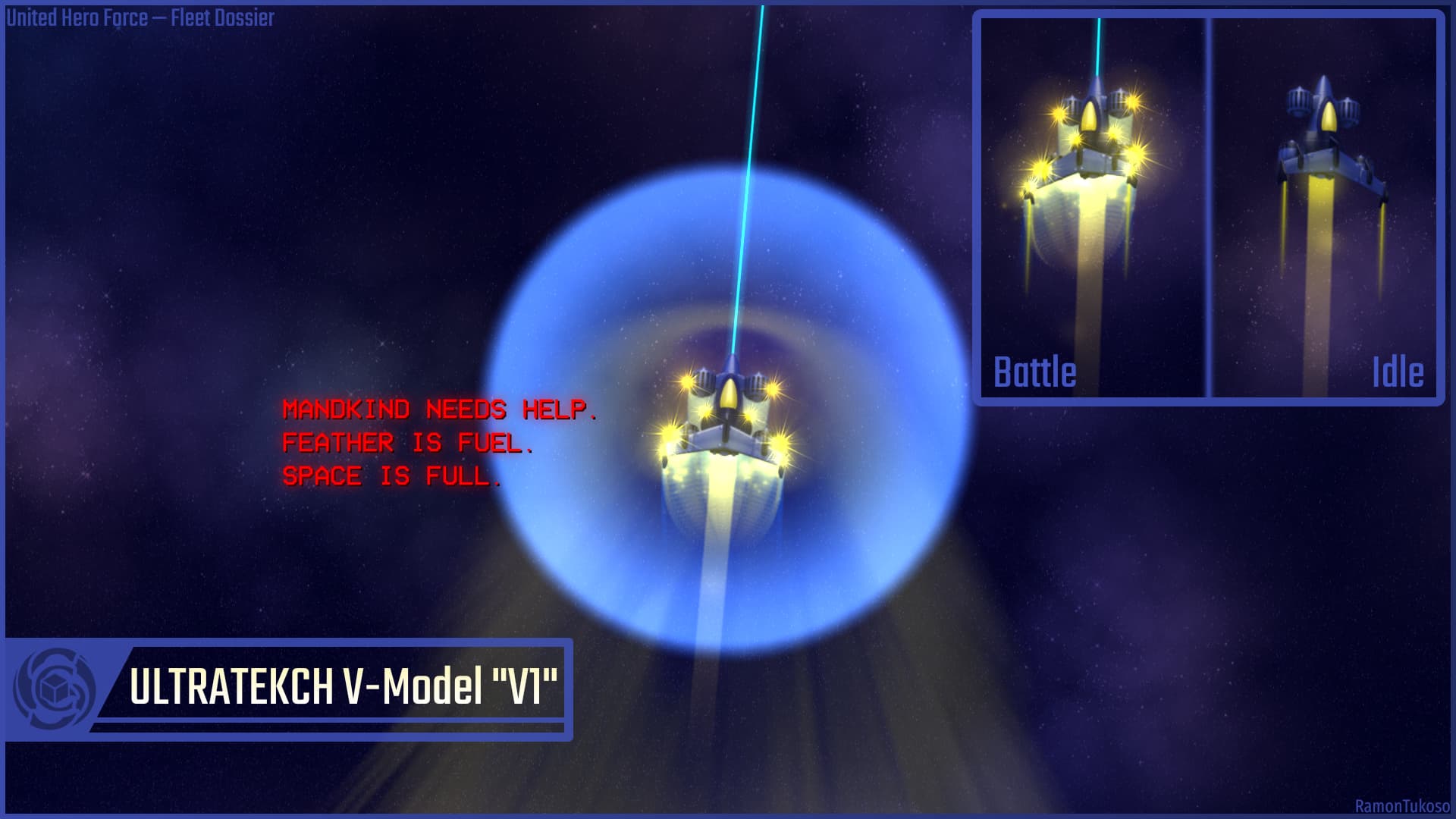 Their newest invention, the ULTRTEKCH V-Model “V1” or simply V1 for short is an experimental Müller, inspired by a special but confidential formula from a long gone civilization. They exchanged the standard plating making up the spacecraft for a more thin and absorbant plating. When you kill a chicken, its blood will then be absorbed into the spacecraft, reinforcing it using that confidential formula. It makes the spacecraft more vulnerable but can utilize the blood of its enemies for self-repair, refueling itself, pretty neat!