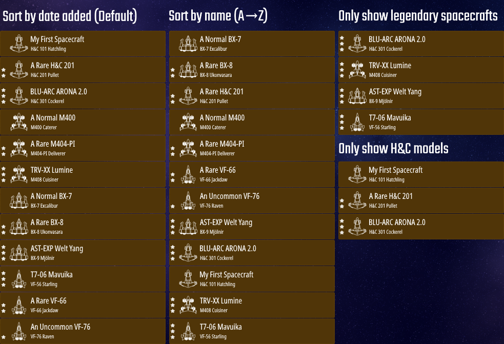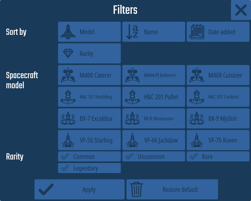 - Filter button (use to sort spacecraft by model/name/date added/rarity and show them by model/rarity)