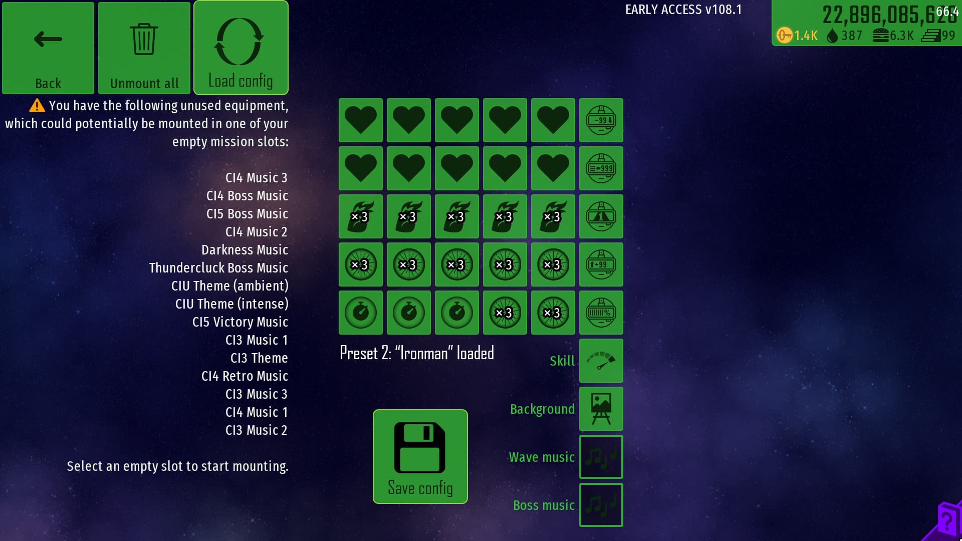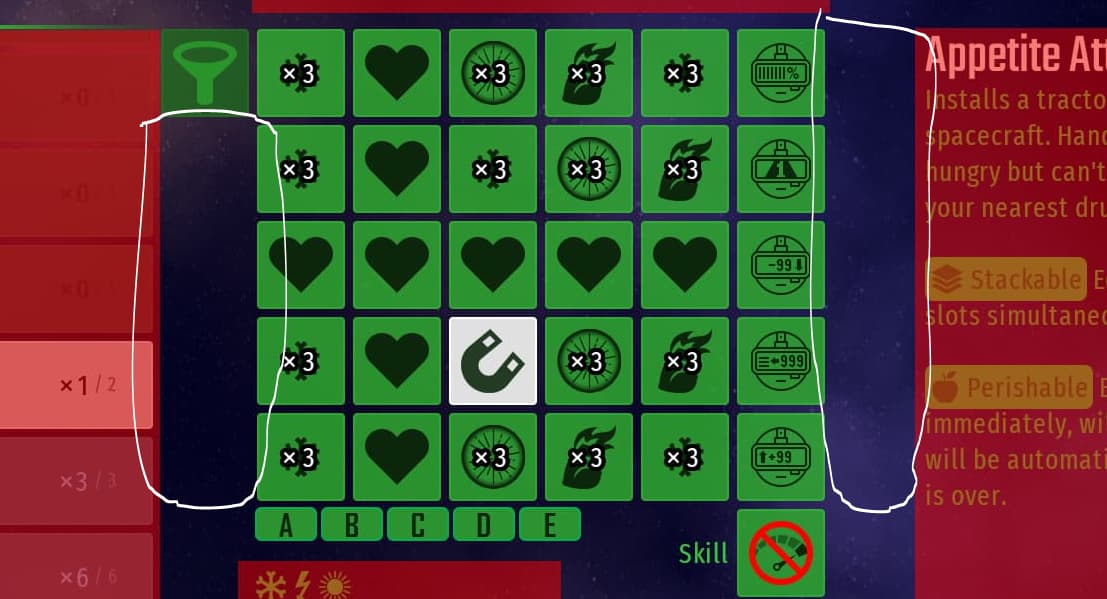 The way the presets will be filled is from left to right from top row to bottom row. So if for instance, I wanted to load Preset 2 but I only had 8 Extra Lives, 12 Damage Amplifiers, 18 Dimensional Phase-outs and 1 Invulnerability Extender in my inventory, it will look like this: