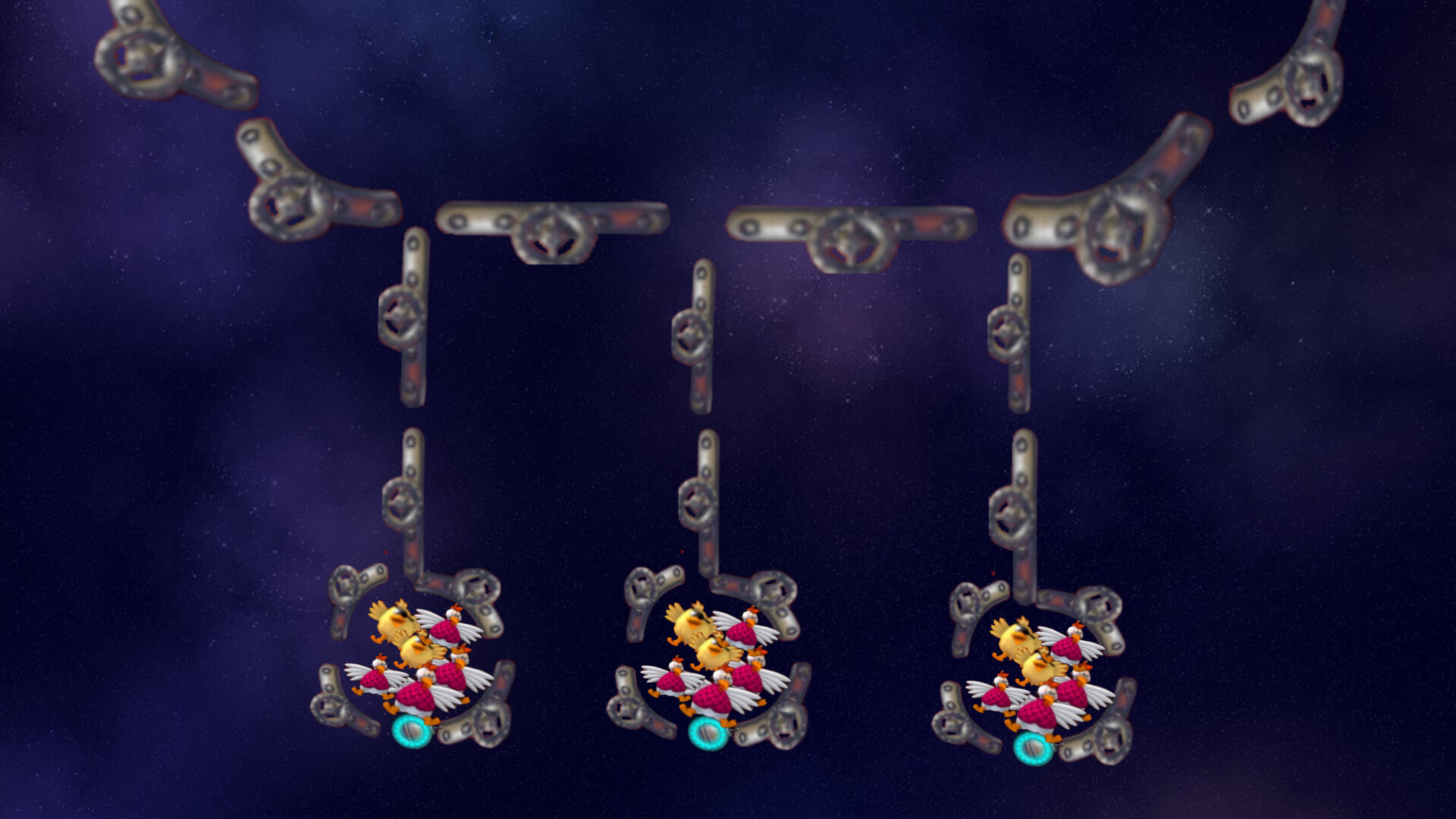 I’m this wave, bars made a necklace and the chickens or chicks are inside of the iron balls that you should kill the chickens or chicks and explode the ball with the bomb of the ball