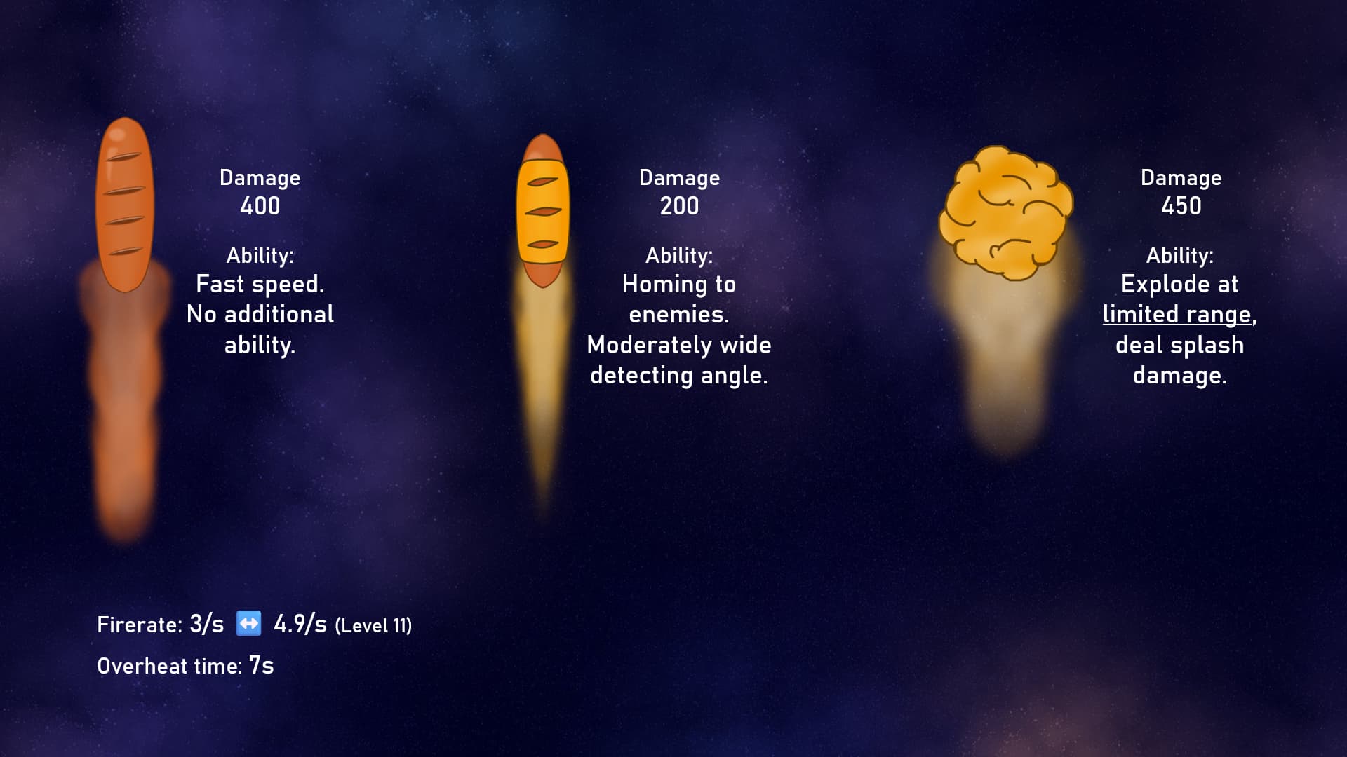 So after equipping this weapon, the player can fire out devastating barrage of three projectile types. Sausage Arsenal has much higher damage than that of Corn Shotgun (at later power levels); however, its firerate is slower and overheat time is faster too. Here’re the projectiles of this weapon: