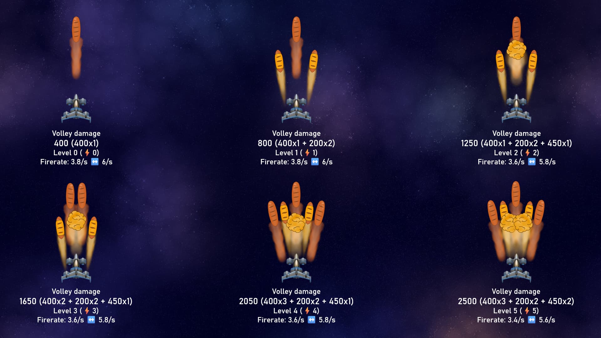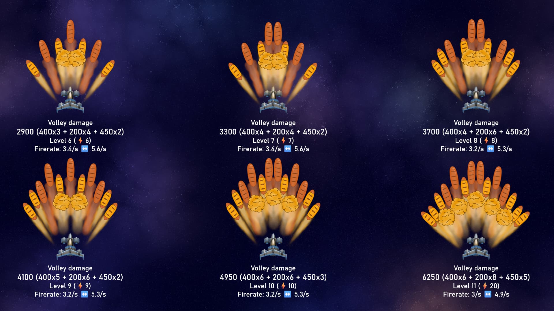 Having the ability to shoot out different kinds of projectiles make the weapon versatile and flexible, however there’re some disadvantages too. The power distribution of each volley is quite unbalanced; moreover, the chasing ability of the second projectile type is somewhat hard to control, therefore sometimes this weapon is not so powerful at much longer distance, especially in various zoomed-out wave.