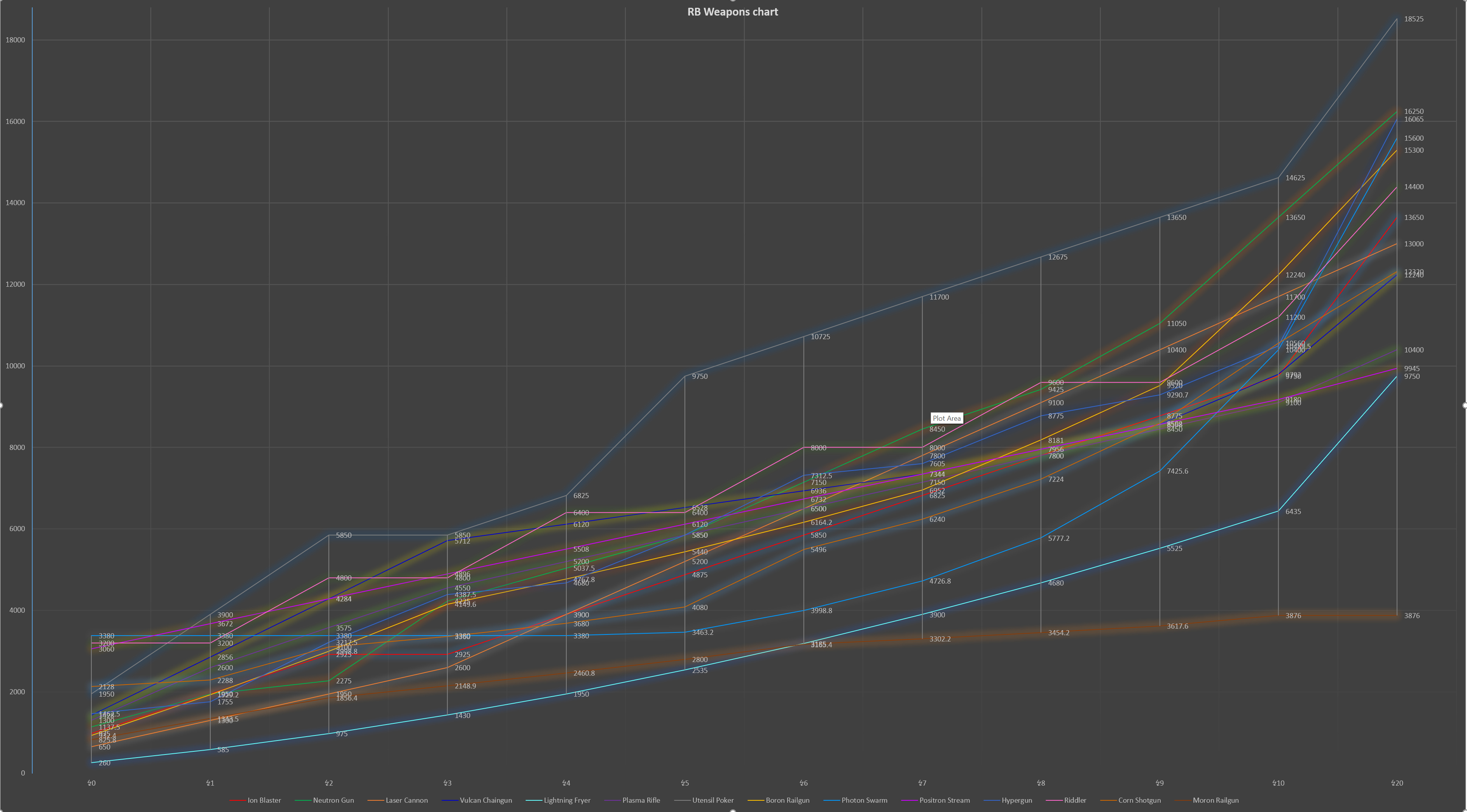 Utensil Poker reigns supreme with Neutron Gun trailing behind it closely. The two weapons are significantly more powerful than the rest. Laser Cannon’s in the middle, Vulcan Chaingun is now the weakest weapon being a whole 12150 DPS weaker than Utensil Poker. The other weapons are just sort of… there.